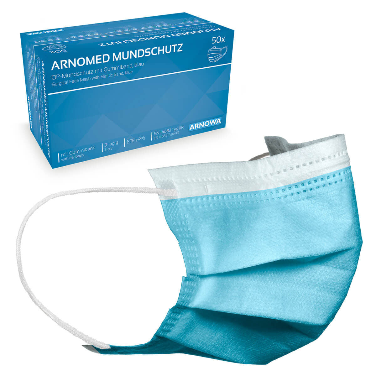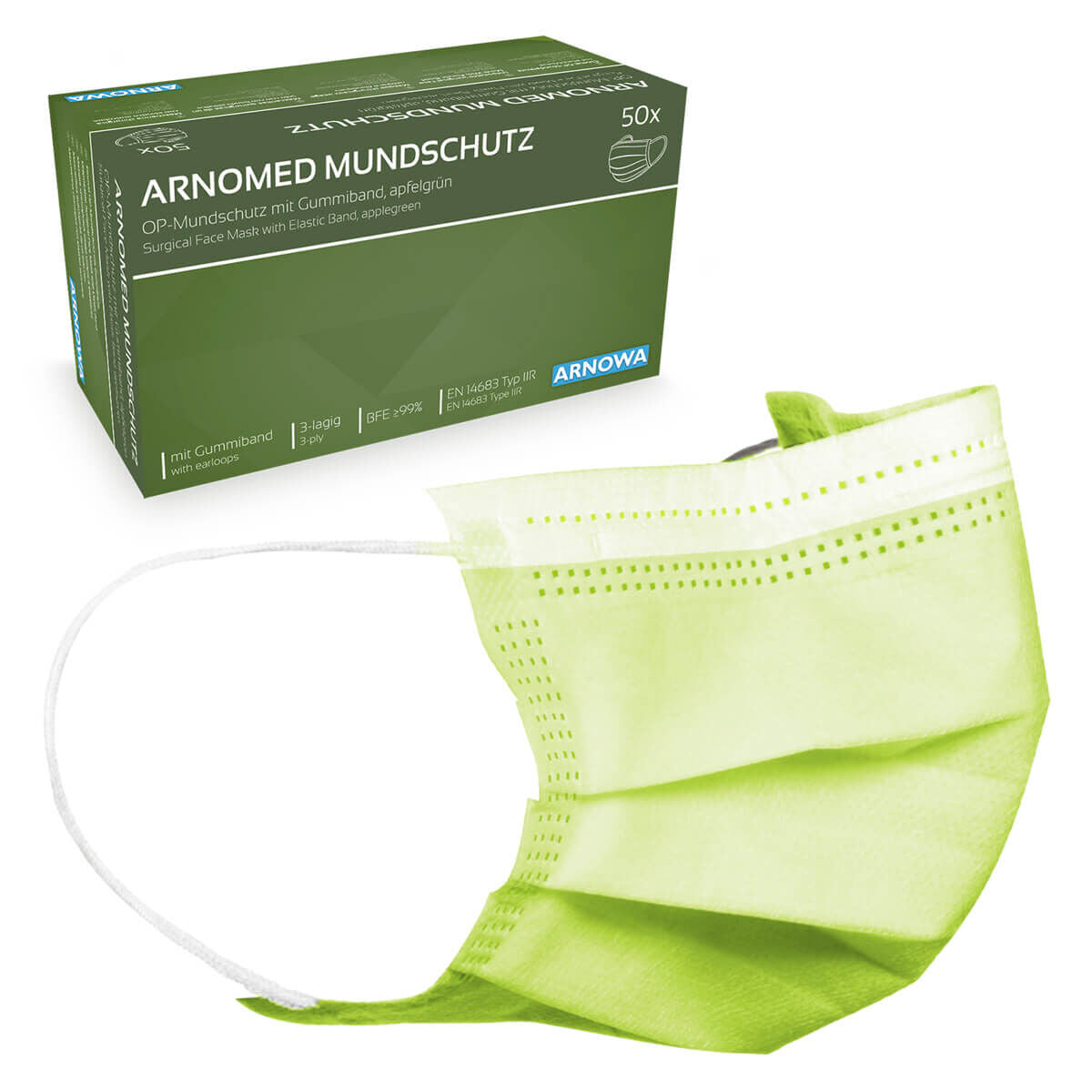 - Engangsprodukt: 3-lags kirurgisk ansigtsmaske i henhold til standard EN 14683 type IIR