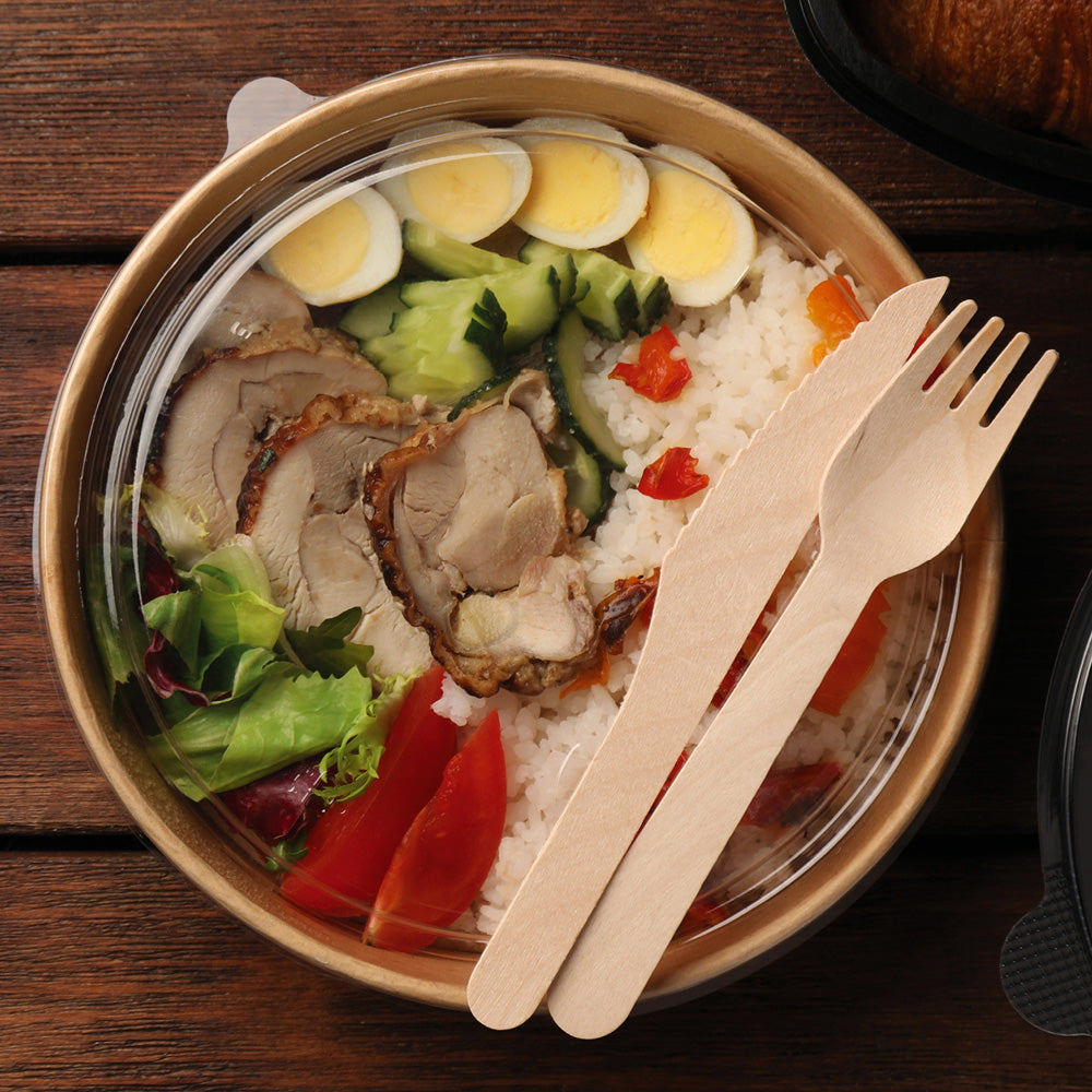 Disse træbestiksæt indeholder en klassisk kniv, gaffel og serviet. Sættene er produceret på en yderst bæredygtig og miljøvenlig måde. Kniv og gaffel er lavet af robust birketræ og opfylder FSC® 100%-standarderne. Den tolagede serviet er lavet af cellulose og er også produceret af vedvarende ressourcer. Hvert sæt er individuelt pakket ind i en kraftpapirlomme. Udstyr dit takeaway-område med disse smukt designede træbestiksæt, og vælg bevidst denne miljøvenlige løsning.