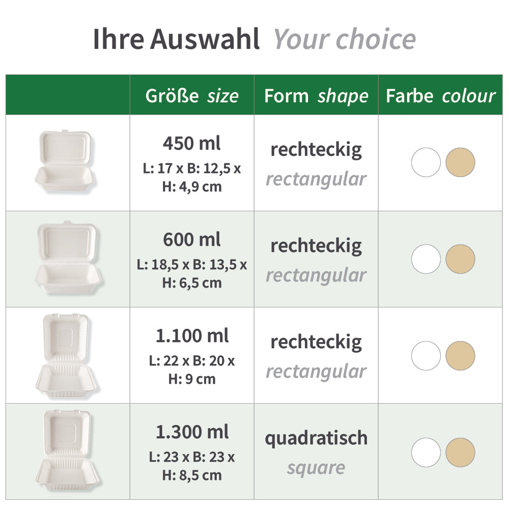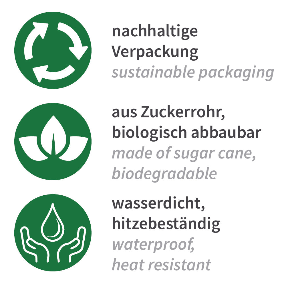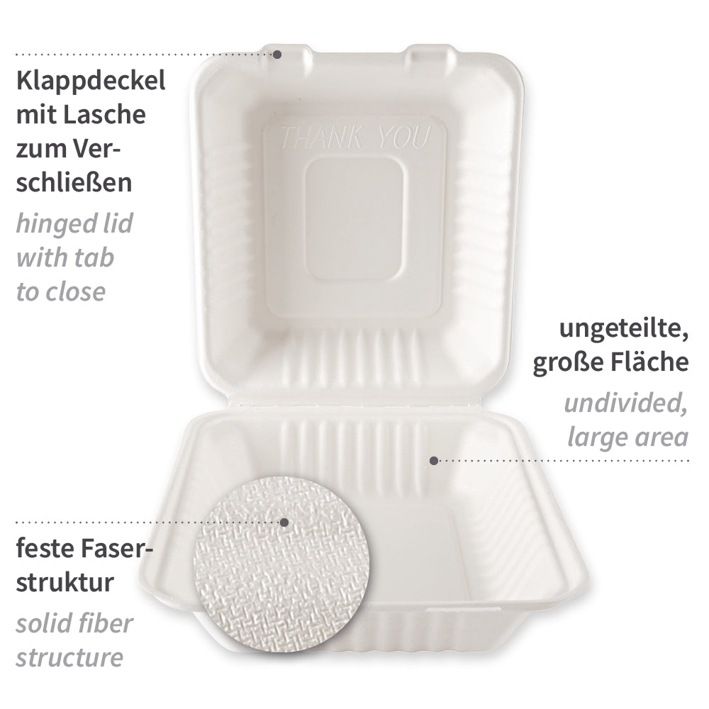 Selv transport af mad med saucer eller dressinger er muligt med sukkerrørskasser, da materialet er meget tæt og robust. Det hængslede låg er nemt at lukke og beskytter din mad under transport. Desuden er madkasserne varmebestandige op til 100°C og egnede til både frysning og genopvarmning i mikrobølgeovn eller ovn.